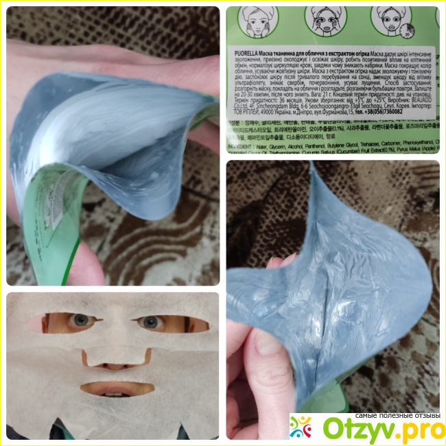 Маска полностью пропитана огуречной эссенцией, кстати, в пакете её остаётся очень много, после того, как маску накладываешь на лицо. Я оставшуюся жидкость никогда не выкидываю, а распределяю ещё не следующий день на лице вместо крема )