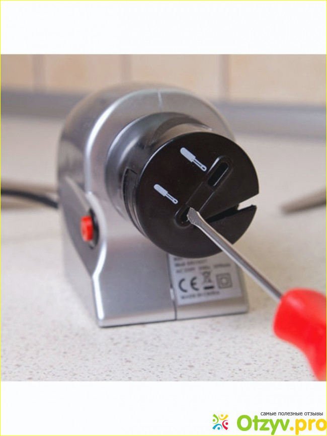 На корпусе у точилки есть специальная кнопка красного цвета благодаря которой она и включается. Работает данный прибор от сети. Это очень удобно и не нужно покупать ни каких дополнительных батареек. Спереди у этой точилки есть специальный носик черного цвета с определенной формы отверстиями. Над каждым отверстием есть еще белая картинка которая как раз вам и подскажет что вы можете поточить с помощью нее.