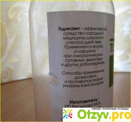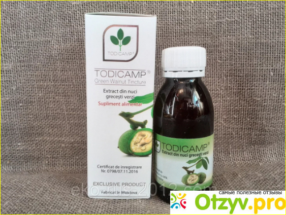 "Тодикамп" - готовая к применению настойка, для приготовления использовался грецкий орех молочной спелости, его выдерживали в керосине, прошедшем предварительную очистку в течение 40 дней.