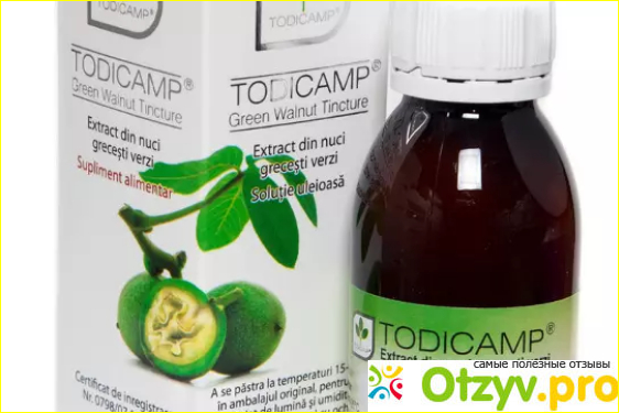 Препарат оказывает противовоспалительное действие. А также обладает противогрибковыми и противопаразитарными свойствами. Примочки и компрессы применяются при прыщах, угрях два-три раза в сутки. Можно смазывать настойкой верхнюю часть носа, скулы, лоб, если человек болен гайморитом или фронтитом. Грецкий орех останавливают выпадение волос, если втирать его в кожу головы через день. При судорогах, грибковых поражениях можно использовать примочки или втирать "Тодикамп" два-три раза в сутки.