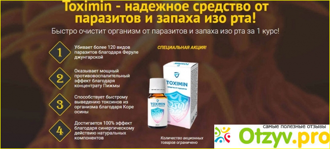 Toximin хорошо справляется с лечением и предупреждением заражения. Он удалит из организма единичных особей, которые пока не дают о себе знать выраженными симптомами и большие скопления червей.
