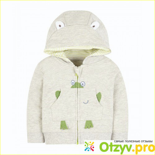 На капюшоне пришиты небольшие ушки, как у лягушонка. Молния легко застегивается без труда, и не заедает, несмотря даже на то, что наш мальчик любит ею играться. Чтобы не прищемился подбородок, есть специальная защита. Край и манжеты этой толстовки эластичные, хорошо сидят на ребенке, пока рукава подворачиваю, как раз на ширину манжет, брала специально на пару размеров больше, чтобы подольше носить эту толстовку. Главное, что рекомендована машинная стирка, стирала при разных температурах и толстовка не полиняла, не потеряла форму. Очень довольны покупкой- и я, и мой малыш.