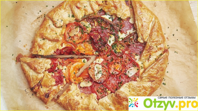 Разверните тесто и раскатайте на слегка посыпанном мукой листе пергаментной бумаги до толщины 14. Перенести на пергаментный противень. Разбросайте сыр по тесту, оставляя границу 11?2". Разложите помидоры и чеснок поверх сыра. Принесите края теста вверх и над заполнять, перекрывая по мере необходимости для того чтобы создать около 1 1?2 " граница; почистьте тесто щеткой с яйцом. Посыпать помидоры морской солью и перцем. Охладите в морозильной камере 10 минут.