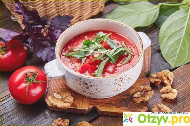Основа этого супа - помидоры, а ведь они очень полезны для нашего организма, в них находится минимум калорий, но при этом они отлично утоляют голод и содержать в себе множество питательных и полезных для организма веществ, которые нормализуют обмен веществ и при этом вы чувствуете себя лучше, здоровее и готовы к работе.
