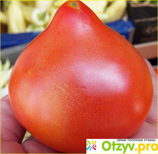 и выглядят огромными из-за больших растений. Я не выращиваю их постоянно в теплицах, потому у меня их рост где-то метр, метр двадцать. Помидорчики имеют странную форму, они круглые, но носик вытянутый, немножко, но это заметно. Мне они нравятся, когда томаты краснеют полностью, они всё ещё тугие и плотные, нарезаются хорошо и не лопаются, особенно это заметно при закупоривании их в банки на зиму. Редко какой сорт может похвастаться тем, что помидоры красные и не лопаются.