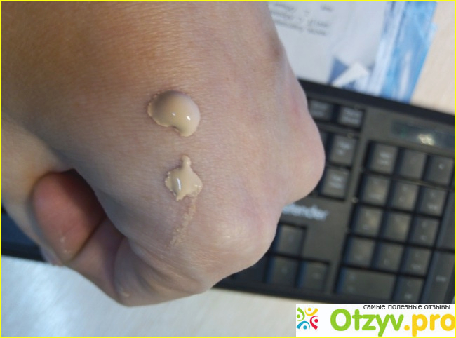 Капля тяжёлая, не разливается, при размазывании оставляет прочный след. Представьте Вы стираете лак с ногтей, одной ваточкой в ацетоне. Руки у Вас потом в белой сухой краске. Так и здесь! Кажется как будто ты в бежевой муке, но при это она хорошо приштукатурена).