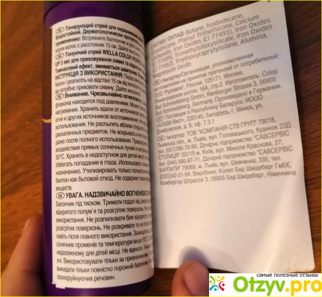 Как обещает производитель, спрей в течении 3 секунд окрашивает корни и седину волос, при этом он не содержит аммиака и окислителей, а значит вполне безопасен для волос и кожи головы. Спрей водостойкий, смывается при помощи шампуня для волос.