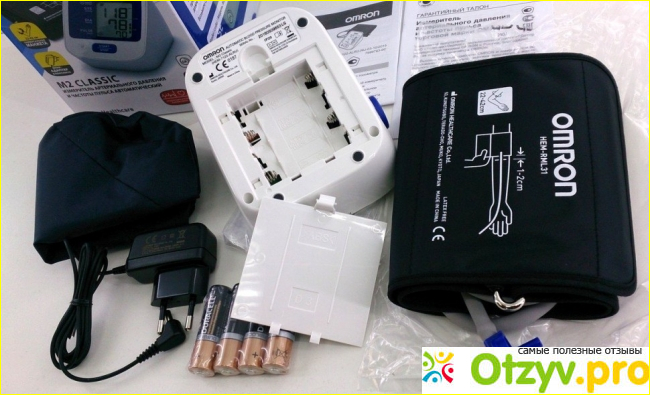 В комплект поставки входит сам тонометр, гарантия, инструкция, мягкая приятная сумочка которая уплотнена изнутри, находится в комплекте шнур питания. Кстати, питание идет смешанное или от батареек которых в комплекте 4 штуки мизинчиковые и его можно взять с собой в поездку либо заряжать тонометр от электричества если вы дома или в гостях. Дальше в комплект поставки входит электронные блок, манжет среднего размера, футляр, адаптер переменного тока, набор батарей что я описывал чуть выше.