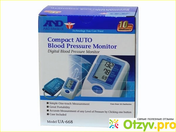 В этом отзыве я хочу остановиться, на мой взгляд, на очень удобном и практичном тонометре AND UA-668. Покупался он нами уже в далеком 2012 году по цене 1300 рублей и служит по сей день. Конечно, среди профессиональных медиков бытует мнение, что лучше всего старенький тонометр с фонендоскопом, вроде бы он точнее, да и стоит дешевле, но опять же, на мой взгляд, электронным тонометром пользоваться гораздо удобней, да и большой погрешности в его действии я не заметил. Приятно отметить, что тонометр AND UA-668 разработан в Японии и изготовлен с применением передовых технологий. В идеальном качестве его изготовления мы убедились за время его использования, недаром же производитель определил срок гарантии данного прибора в 10 лет, правда на его составляющие, куда входят и манжеты, срок гарантии составляет один год. Итак, тонометр Тонометр AND UA-668 продаётся в картонной хорошо оформленной упаковке, на которой есть вся необходимая для покупателя информация на русском языке. Это компактный, да, к тому же, ещё и автоматический электронный приборчик, позволяющий измерять наше с вами артериальное давление. Продаётся он вместе с кейсом, который представляет из себя очень удобный мешочек. В комплекте к самому прибору есть также соединительная трубка и стандартная (22-23 см) манжета. Тонометр AND UA-668 оснащен специальным электронным экраном (дисплеем), на котором в хорошо читаемом виде показываются результаты измеренного вами давления, а также ваш пульс. Помимо давления и вашего пульса (на экране сердечко), прибор может показывать и оставшееся напряжение батареек, от которых питается данный прибор (показывается маленькая батарейка). Забыл сказать, что питание прибора осуществляется от четырех аккумуляторных батареек, зарядки которых хватает на довольно долгое время. К сожалению, шнур для подключения его к сети 220 вольт в комплекте не предусмотрен, но для его подключения есть специальное гнездо и данный электрический шнур можно купить отдельно в магазине «Медтехника».