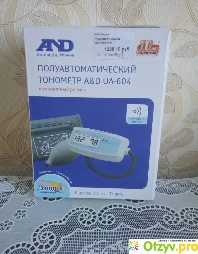 Полуавтоматический тонометр модели UA- 604 мужу подарила моя сестра 2 года тому назад, так как муж является гипертоником и для измерения артериального давления ему нужен был новый аппарат, так как старый из-за частого использования пришел в негодность. Стоимость тонометра на тот период составляла 1288 рублей 10 копеек.