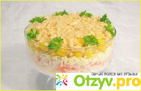 - Всё смешиваем, солим, перчим по вкусу. Добавляем майонез. Перемешиваем. Также можно красиво уложить слоями или же в глубокие прозрачные стаканы. Получается очень нежный салат.