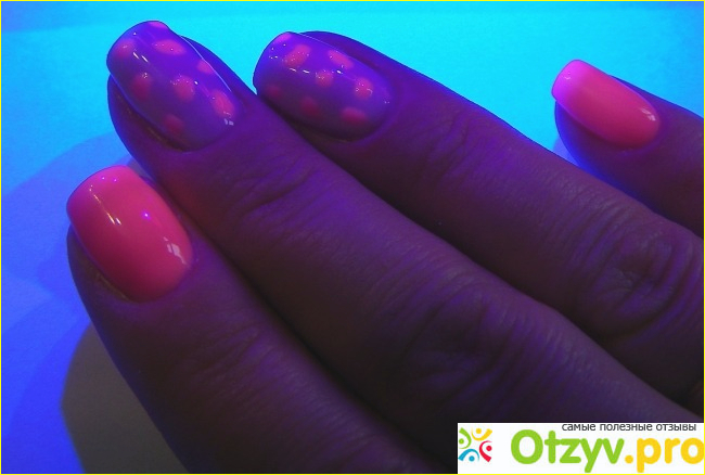2. Далее нанесла в хаотичном порядке розовые кляксы по задуманному дизайну. Вот так светится неон под ультрафиолетовыми лучиками