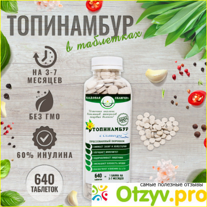 Топинамбур в таблетках — является природным БАДом. В составе продукта, собран комплекс биологически активных веществ, среди которых: инулин, пектиновые вещества, клетчатка, железо, кальций, медь, магний, кремний, цинк, фосфор, витамины группы В1, В2, В6, PP, C.