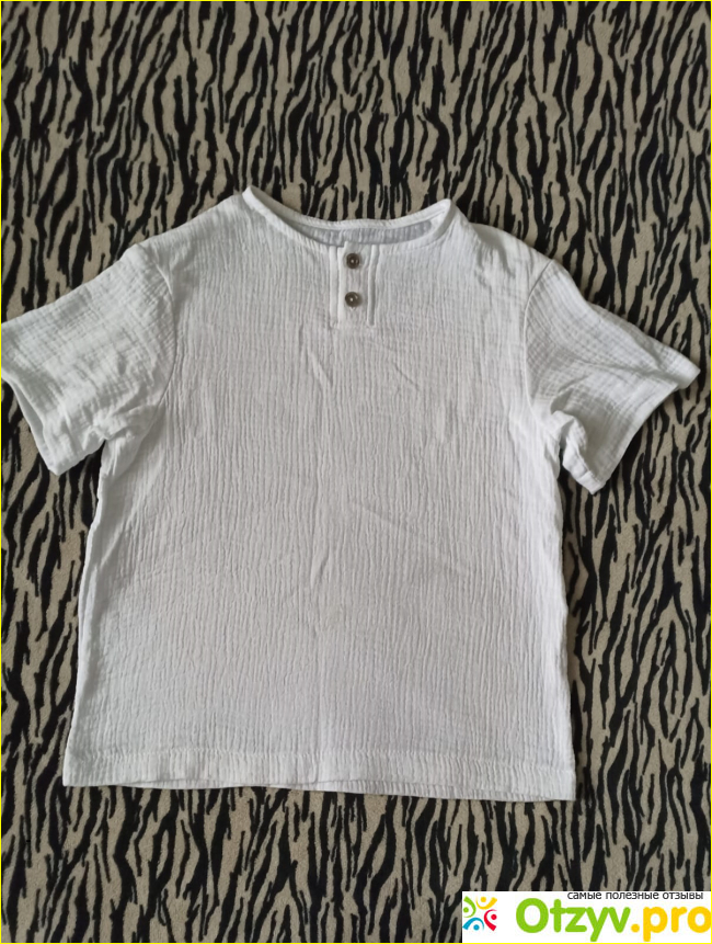 обычную не хотелось, так как смотрелось как пижама, нашла у них из жатой ткани, с пуговицами у горла. Вроде и простая. но очень интересная. Ткань приятная на ощупь, в ней не жарко. Стирали естественно очень часто. не села. В общем классная футболка за классную цену.