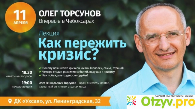 Олег Торсунов - популяризатор здорового образа жизни, специалист по семейным отношениям и личностному росту. Автор многих книг и лектор. Ежегодно дает множество семинаров по стране и за ее пределами. Также Торсунов является основателем учебного центра Сарасвати, с помощью которого несет в массы ведические знания, помогает людям самосовершенстоваться и строить свою жизнь гармонично. Полную информацию об успехах, заслугах и целях Торсунова можно получить на его официальном сайте. Он довольно качественный и продуманный.