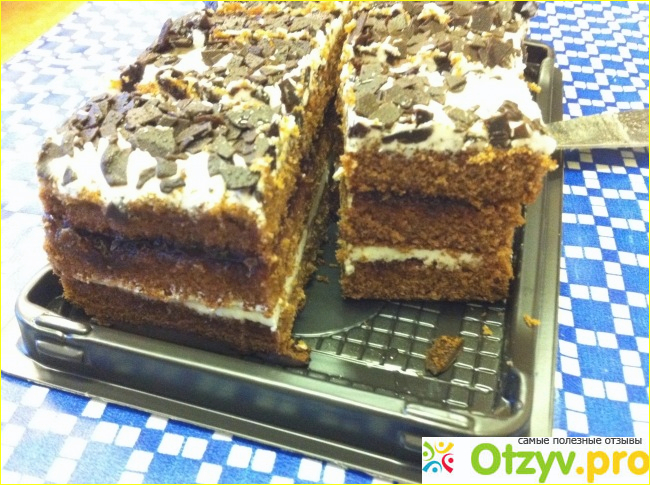 Сверху торт покрыт тем же нежным кремом и довольно обильно посыпан шоколадной крошкой. Удивительно, но шоколад очень приличного качества: тает во рту за секунды, к небу не прилипает.