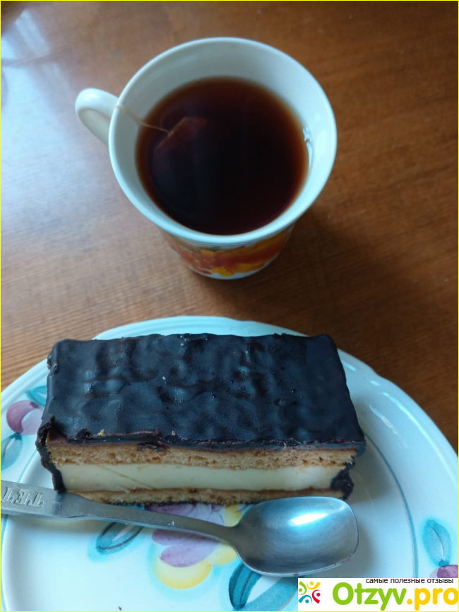 На фото видно, что на бисквите приличный слой шоколада. Бисквит хорошо пропечен. Прослойка нежная. В общем, все как всегда, производитель себе не изменяет и выпускает вкусные тортики! Спасибо!