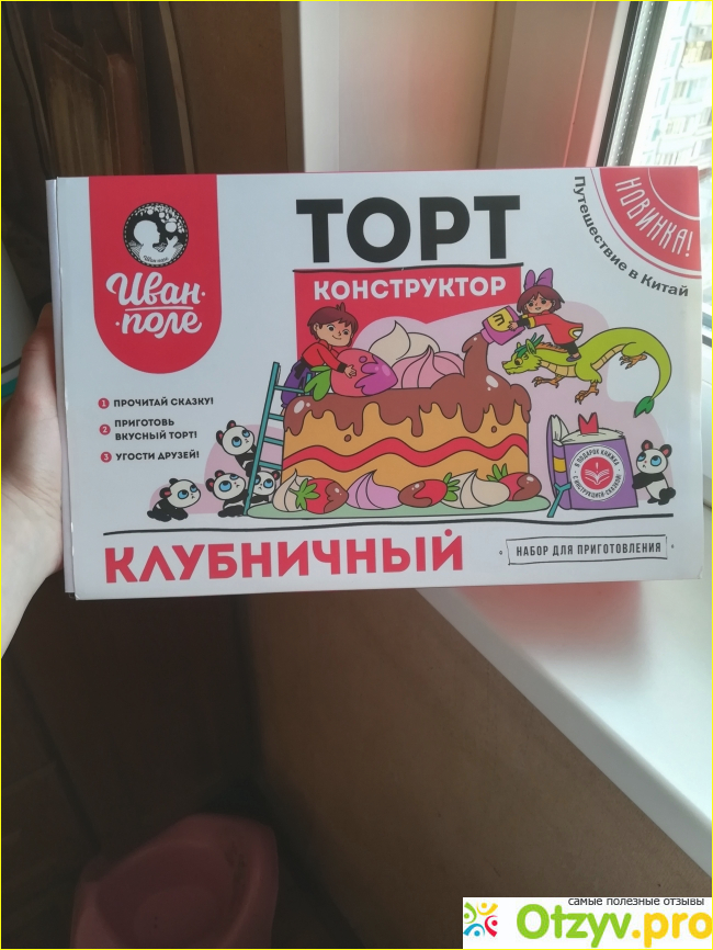 Нужно было что то творческое, но весь ассортимент детских наборов для творчества был уже испробован. Я знала магазин "Иван-поле", заказывала почти всегда одни и те же диетические товары, и честно говоря не вникала в появление новинок. Но зайдя на сайт, для очередного заказа, мне попался торт конструктор, я прочитала описание и меня он очень заинтересовал. Естественно мы его заказали. Сестрёнка была в полном восторге, такого ей ещё никто не дарил, тут и творчество, и самостоятельность, и результат, который приятно и вкусно удивил семью. Теперь по существу, приключение начинается с инструкции, которая выполнена как рассказ о путешествии в Китай братика с сестрёнкой, и попутно на страницах поэтапно в виде картинок показывается инструкция по приготовлению. В набор входят, пластиковая мисочка, подложка для торта, пакетик сухой смеси для суфле, смесь для крема, печенье, клубничный топпинг, и шоколадная масса для украшения и заливки торта. Из подручных материалов понадобится миксер, стакан с кипячёной водой, и ещё одна ёмкость для смешивания ингредиентов. Дальше все проще некуда, производитель позаботился о минимуме действий, смешав все нужные игридиенты в нужных пропорциях в одном пакетике. От ребенка требовалось только засыпать, перемешать, промазать слои, украсить. Я думаю что даже ребенок лет 8ми справился бы с этой задачей, в присутствии взрослых. В итоге через полчаса ( ну правда в холодильнике ещё часик мы дали пропитаться) мы получили чудесный, воздушный торт. Очень вкусный, лёгкий, мне чем то Панчо напомнил, но с клубникой. Ребенок счастлив, что получилась такая вкуснятина своими руками. Я не знаток тортов, но попробовала конечно пару лодечек ради стараний сестрёнки, и по мне, именно по вкусу не отличается от тех, что мы раньше на праздники покупали. Ну конечно идеально сделать форму и украсить не получилось, но вкус от этого не пострадал) а шоколадной пасты оказалось в маленькой баночке так много, что вылив больше чем требовалось украшение, она ещё осталась. Цена на сайте 495 р за набор, нам вышло дешевле, так как мы не только его заказывали, и у нас скидки. Но 500 р это цена в детском мире за какой нибудь творческий набор картинки, которую надо обклеивать бисером, или большого пазла. В данном случае, это не просто торт, который чуть подороже можно и в магазине купить, а именно эмоции ребенка, проявления его самостоятельности, и это был действительно подарок сюрприз
