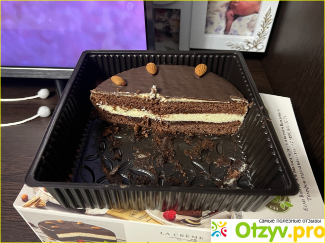 Но Миндальный один из любимых. В том числе и из-за его размера. Маленькие 300 граммовые очень быстро съедаются. А этот можно дня на 3 растянуть, если никто не присоседится к трапезе))) В этот раз я твердо решила ни с кем не делиться. В пятницу открыла, а в воскресенье вечером доела последний кусочек. Больше, считай, за двое суток ничем и не питалась. Устроила себе праздник сладкоежки. Самое замечательное, что именно этот вкус мне не надоедает и не приедается. Люблю миндальные орехи и все, что содержит их в своем составе. А тут они прям натуральные, сверху на глазури даже цельные. Бисквит и крем в идеальных для меня пропорциях. У всех, конечно, вкусы разные. Но для меня это идеальное дополнение к хорошему отдыху.