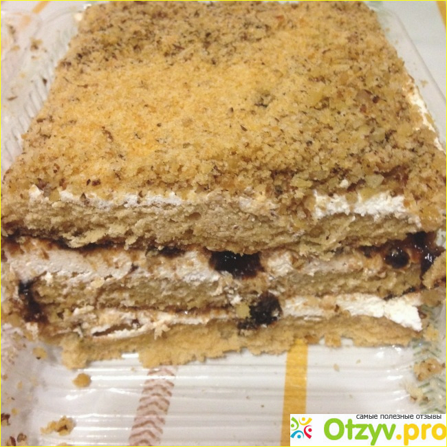 Я не надеялась на то, что тортик будет лучше по вкусу, чем я ела раньше. Но и не думала, что будет так не вкусно. Как будто все правильно. Три коржа бледного цвета (у подруги коржи имеют цвет гречишного меда) не сухие. Они обильно смазаны белковым кремом. Мелко нарезанный чернослив имеется и мне его было вполне достаточно. И привкус орехов, которые измельчили в крошку и присыпали верх торта вместе с бисквитными крошками, хорошо ощущается.