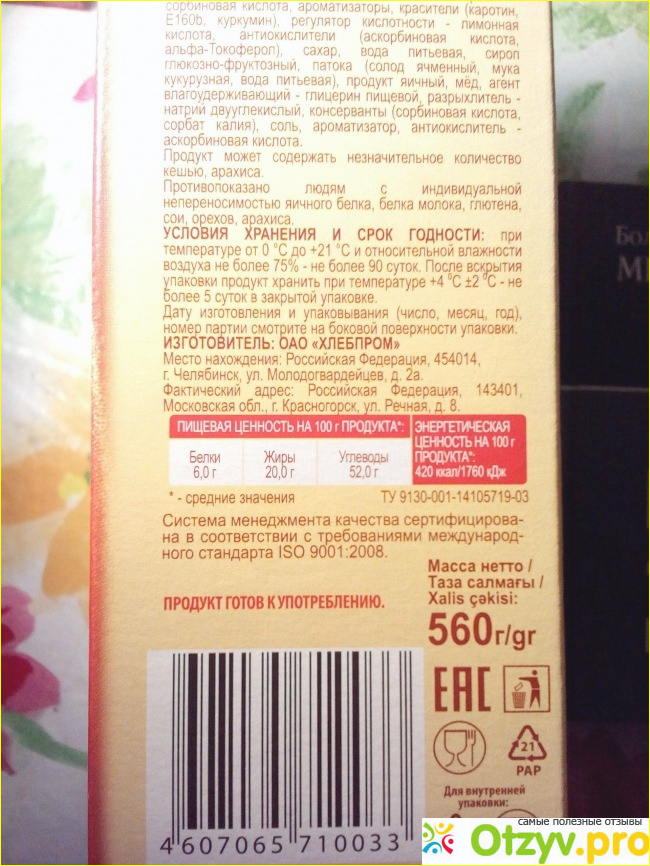 Конечно, в нашей семье почти никто не смотрит на состав, сетуя "ничего натурального уже нет", а вот в составе имеются и консерванты, и красители, и ароматизаторы, зато производители все честно указали. Хотя я считаю, что если и продавать "такие" продукты, то уж хотя бы подешевле. Понимаю, высокие цены за качество, а если из натурального только сахар и мука, а сам весь состав большой? Было бы лучше и полезнее, если сахара было бы поменьше, а меда - побольше... все-таки торт называется "Медовик".