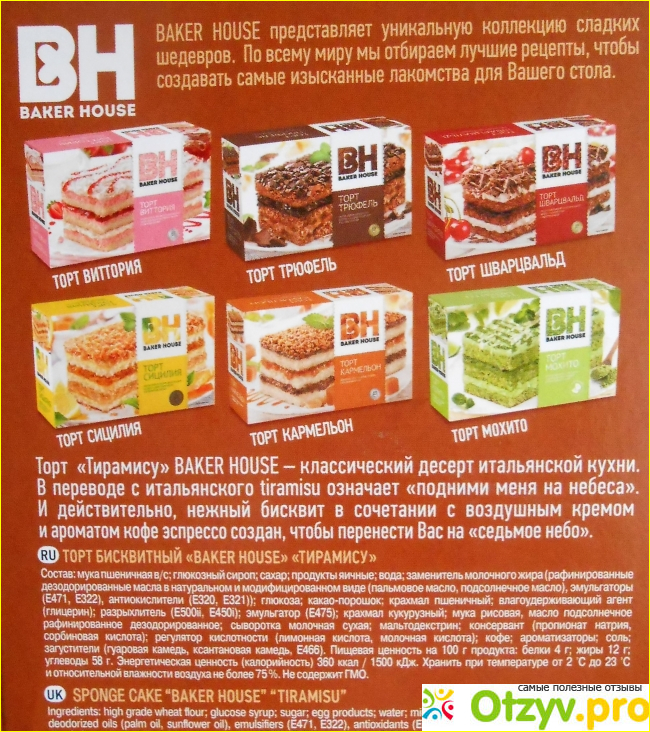 Сегодня мой отзыв о торте Тирамису от данного производителя. Как-то напала на его страничку в одной из соцсетей, и у меня создалось впечатление, что продукция Бейкер Хаус безопасна для здоровья, поскольку она производится по классическим рецептам итальянской и немецкой кухни. С интересом прочитала советы о правильном питании, которые опубликованы в этой группе. А какие там фотографии! Все пироги, пирожные, тортики так аппетитно выглядят! Они прочно врезались в мою память, и когда я увидела в магазине знакомую упаковку, то ни секунды не раздумывая, положила коробочку в корзинку.