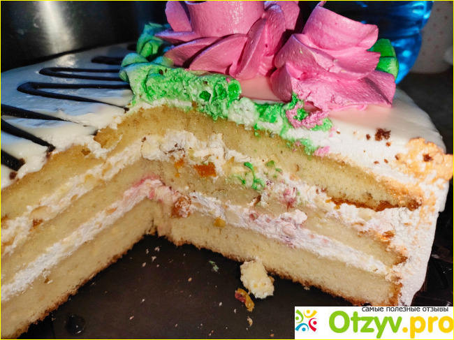 Торт порадовал. Бисквит плотный, мягкий. Три светлых коржа. Низ хорошо прожарен, верх белый. Кажется, что он срезан. Нижний корж два сантиметра, остальные чуть меньше.