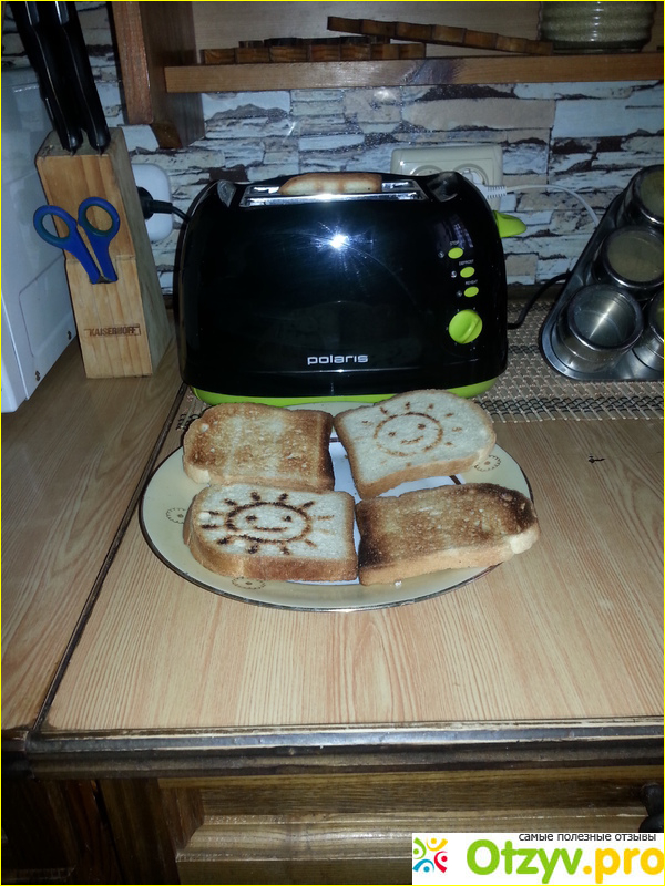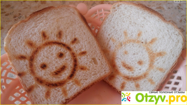 Вообще, покупкой я осталась крайне довольна! Очень удобно когда не охота готовить завтрак достал хлеб, бросил в тостер, подождал пять минут и готово сразу можно есть! Очень нравится готовый поджаренный хлеб моему сыночку. А все потому, что тостер буквально выжигает на хлебе узоры солнышком. Получается очень интересно)).