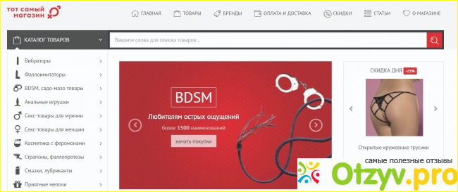 Интернет-магазином «ТОТ САМЫЙ МАГАЗИН» tsmagazin.ru пользовалась несколько раз. Расскажу о его особенностях и отличиях от других магазинов для взрослых. Очень удобный и понятный интерфейс сайта, найти необходимый товар не составит труда, всё "разложено" по категориям.