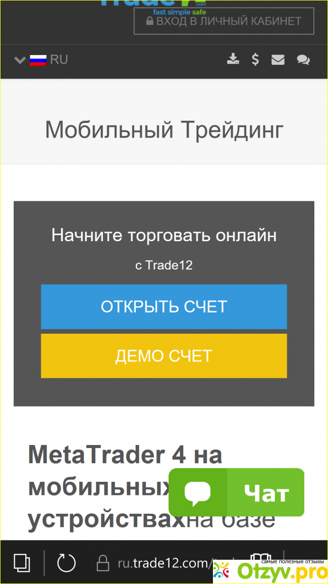 Сайт Trade12 com, предоставляет инвесторам возможность работать в профессиональном торговом терминале Meta Trader 4. Так же у начинающих есть возможность потренироваться сначала на демо счете, и лишь после того, как они будут готовы, открывать реальный торговый счет.