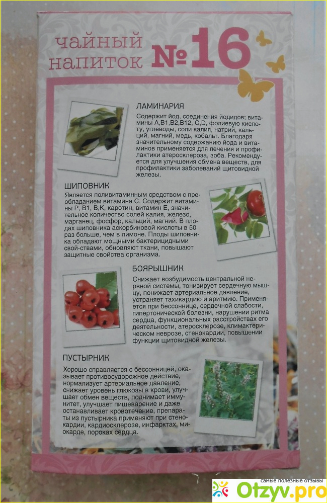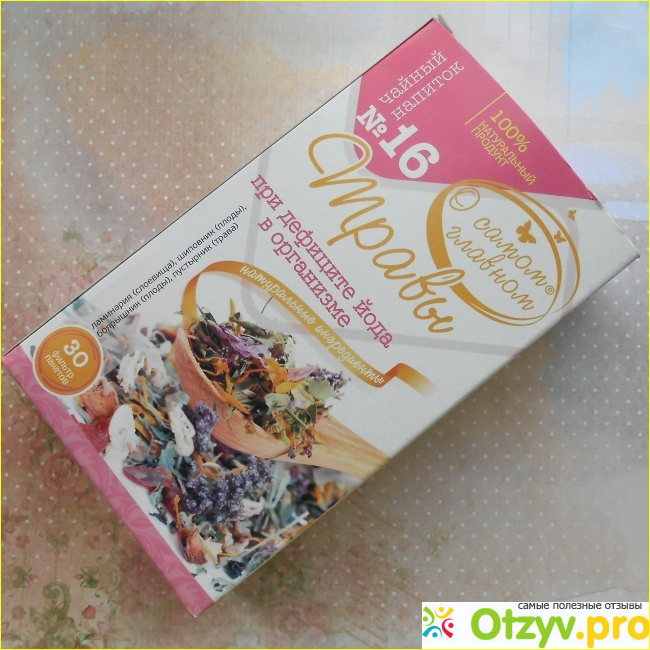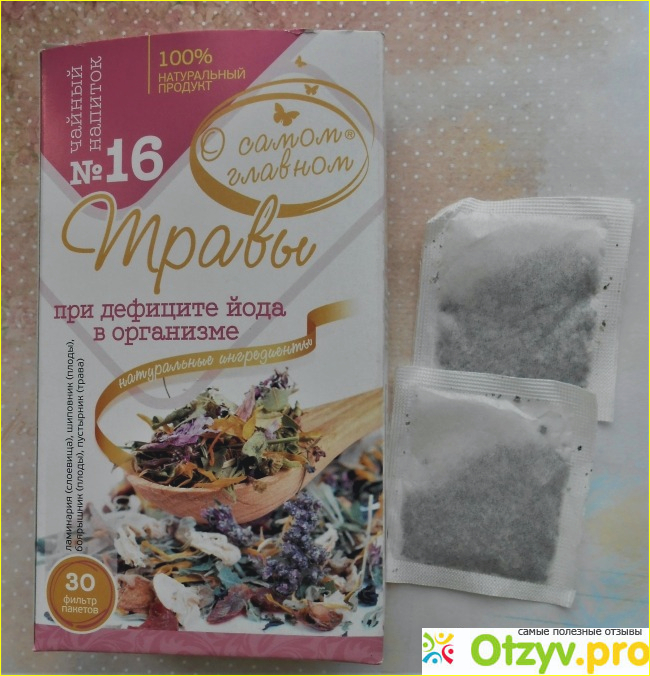 Словам ситуация возникла едва ли не тупиковая. Но мне на помощь пришел чайный напиток №16 уже известного мне бренда "О самом главном". В его состав входят Травы, способные восполнить дефицит йода в организме. Основу этого фитопрепарата, как и других лечебных чаев этой марки, составляет зеленый чай, кроме того, в него входят слоевища ламинарии, плоды шиповника и боярышника, трава пустырника и отруби пшеничные. Хоть я не большая любительница зеленого чая, но во имя здоровья решилась частично заменить им кофе.