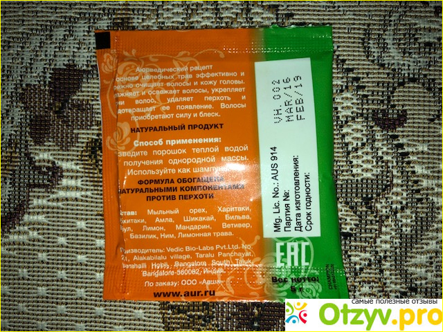 Порошок расфасован в маленькие пакетики (вес всего 5 гра ммов), предназначенные для разового применения. Но на мои не длинные волосы одного пакетика хватает на два мытья головы.