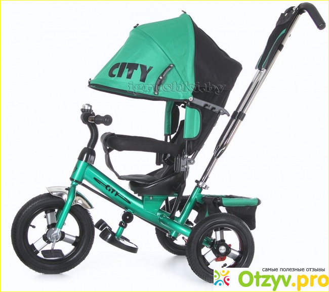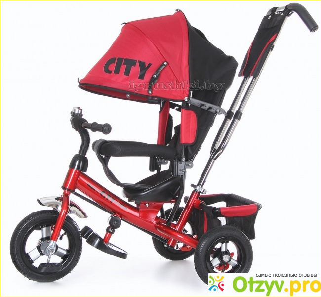 Кроме того что велосипед оснащен хорошей и добротной ручкой, он обладает еще массой полезностей. Так же у велосипеда есть большой капюшон который послужит защитой для малыша от солнца и дождя. Присутствуют прочные надувные резиновые колёса: переднее- 12 дюймов, заднее- 10 дюймов, которые не подвергаются проколам. Металлическая рама удерживает всю конструкцию велосипеда, что делает его более прочным и долгосрочным. Регулируемый капюшон, позволяет закрыть малыша от дождя или солнца. Прилагается в комплектации к велосипеду сумка для мелочей, маленький звоночек на руле, защитный съёмный бампер, специальная подставка для ножек и достаточно вместительная и удобная корзина для покупок.