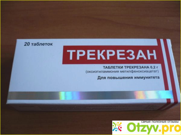Препарат из разряда иммуномодуляторов, обладающий выраженным адаптогенным свойством. В общем, он по сути предназначен для стимуляции выработки интерферона, той самой клетки иммунной системы, которая защищает наш организм от врагов. Трекрезан должен повышать и корректировать иммунный статус, активировать его клетки, стимулировать макрофаги и фагоциты организма. Трекрезан должен укреплять иммунную систему, повышать выносливость организма, особенно при умственном и физическом перенапряжении, снижать негативное воздействие токсинов, шлаков, повышать иммунитет и сопротивляемость организма кислородному голоданию и неблагоприятным условиям окружающей среды. Он помогает при усталости, переутомлении, слабости после длительных простуд, при интенсивных физических нагрузках. Он довольно удобен в использовании (первый день 3 раза, затем по 1 р. в день до конца упаковки). Ряд пациентов четко отмечают положительный эффект от приема."Трекрезан" - это иммуномодулятор, который имеет очень мало побочных эффектов при длительном применении у пациентов.