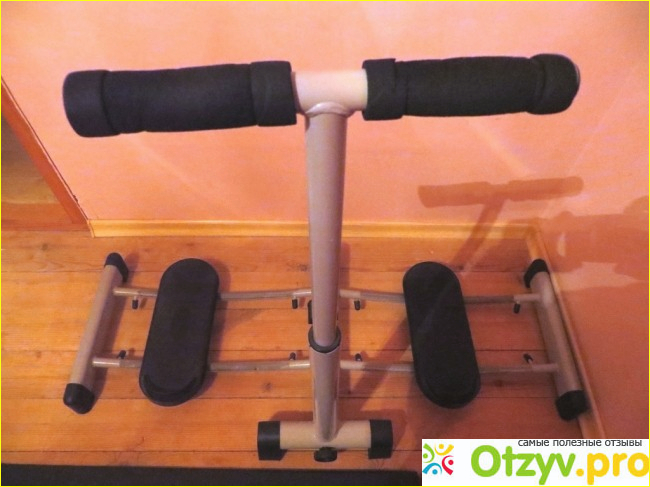 Собранные тренажёр занимает достаточно мало места в квартире, и я его отвела Небольшой уголок в комнате. Но если его собрать, то места он занимает значительно больше, и на это надо рассчитывать, он сразу раздается в ширину. При разборке и сборке этого устройства следует проявлять определенную осторожность, чтобы не была сорвана резьба на нижней перекладине. Фиксация педалей и боковых перекладин производится при помощи болтов. Сам тренажер выполнен из железа, но резьбу и педали выполнили из пластика, который является достаточно хрупким материалом, и поэтому нужно быть очень внимательным разбирая и собирая тренажер. Потому сборку и разборку производить довольно легко, проблемы могут возникнуть только с подгонкой резьбы. При проведении тренировочных занятий тренажер достаточно устойчивый, однако занимаюсь на нём не следует слишком проводить упор на ручку. Перекладины снизу, на которых размещаются педали имеют небольшое искривление посередине, - это сделано с целью, чтобы максимально сделать нагрузку на ноги. При проведении тренировок все движения делаются до максимального упора, но не произведя касаний, что делает задачу более сложной, ну и разумеется при правильном выполнении всех упражнений можно достичь максимального эффективного результата.