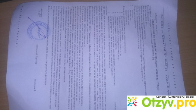 где должны были протянуть все узлы , НО сразу после ТО в первые же 15 минут поездки при спуске со склона отлетел левый шатун, кое-как остановившись я увидел, что открутился болт шатуна, деформировалось посадочное место и квадрат каретки, прикрутив шатун отправился домой, но это не все, пропал задний тормоз (гидравлика), при осмотре так же не были затянуты винту машинки, обалдев от такого, ведь в этот день было ТО, на котором должны были проверить все винты, но видно механик решил не заморачиваться, через 2 дня привез велосипед в магазин, написал претензию, с просьбой заменить перечисленные детали, на что мне через неделю выдали отказ, аргументировав, что это я сам все раскрутил, будто бы мне заняться нечем, ведь самое , что важное , что все произошло сразу после ТО и как оказалось заключение выдал тот самый механик проводивший ТО, на мою просьбу, как и в первый раз, позвать старшего менджера или директора, продавцы хлопали глазами и отвечали , что они на выходном, ситуация пока что никак не разрешилась, но больше я ни ногой в этот ужасный магазин, и никому не советую! Фото заключения прикрепляю