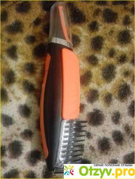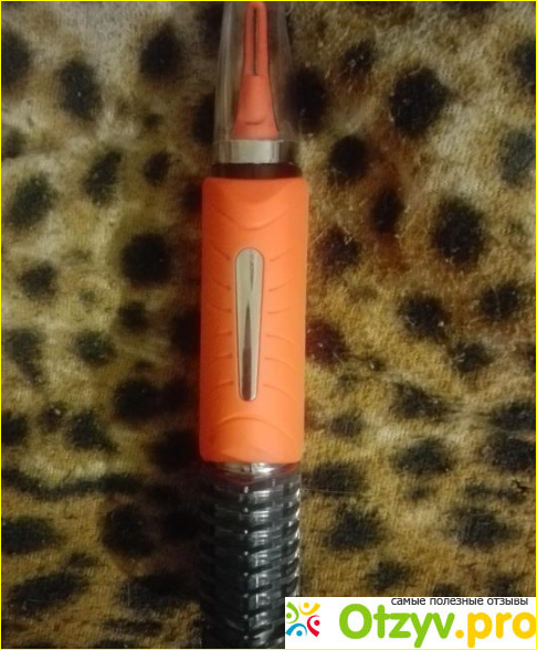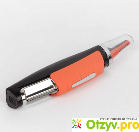 У Триммера Аполлон пластиковый корпус черного цвета, вполне приемлемого качества. А с одной стороны, где ложатся пальцы находится прорезиненная оранжевая вставка. На конце тонкий носик. Именно он является работающей частью. В одной его стороне по всей длине находится тонкое лезвие. Минитриммер помогает делать ровные края у усов и баков. И именно этим кончиком получается по кругу состригать в ушах и носу.