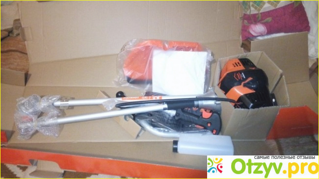Начну с комплектации и помимо самого устройства идет также плечевой ремень, катушка с леской, диск/нож, а также руководство пользователя на русском языке информация также присутствует.