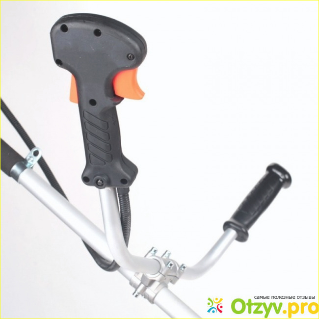Очень удобная ручка T-образной формы, как на велосипеде, сама она складная и можно регулировать ее высоту, исходя из своего роста и это очень важный момент. Мотор же находится наверху. Пару слов о двигателе. Мощность движка составляет 2,5 лошадиные силы, тип двигателя - бензиновый, двухконтактный. Топливный бак в данной модели триммера предусмотрен объемом 1,1 литр. Предусмотрена и тормозная система двигателя, что очень удобно.