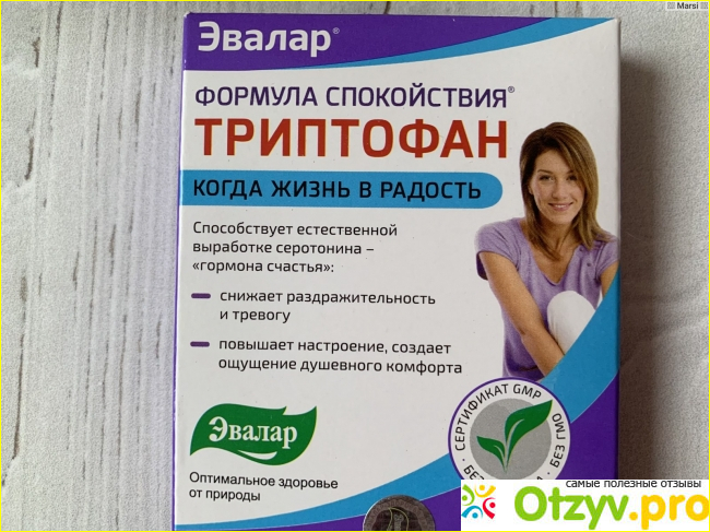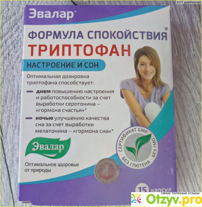 Препарат "Формула спокойствия Триптофан" в дневное время оказывает благоприятное воздействие на организм, помогает сохранить спокойствие, равновесие, безмятежность; в ночное время триптофан действует как мягкое успокаивающее снотворное средство, дает возможность полноценно выспаться. Более того, в его составе содержится L-триптофан и витамины группы В, вместе они взаимодействуя синтезируют выработку того самого гормона счастья, а в ночное время синтезируют гормон сна – мелатонин.