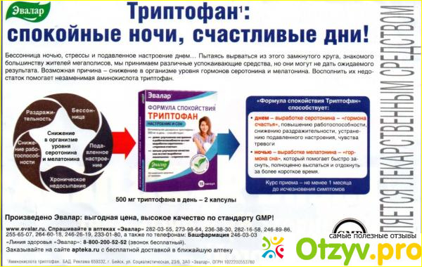 Сегодня я вам как раз и хочу посоветовать, а так же порекомендовать на такой случай жизни очень хороший БАД от компании Эвалар, который называется Триптофан. Его я купила по совету в аптеке, просто пришла и рассказала свою проблему и она посоветовала пропить мне именно его. Так как сама его ни раз принимала. А теперь я хочу поделиться этой информацией еще и с вами, так как может быть кому-то он действительно окажет большую помощь.