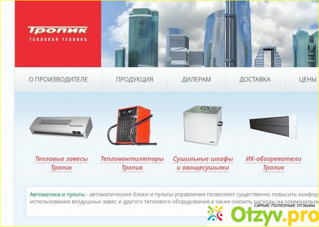 Наиболее интересен раздел "Продукция", тут представлен большой ассортимент товара, из которого вы можете выбрать любой, который вас интересует. Здесь есть и тепловентиляторы, и сушилки для овощей и грибов, и инфракрасные обогреватели. Отдельно представлены различные пульты для оборудования и прочая автоматика.
