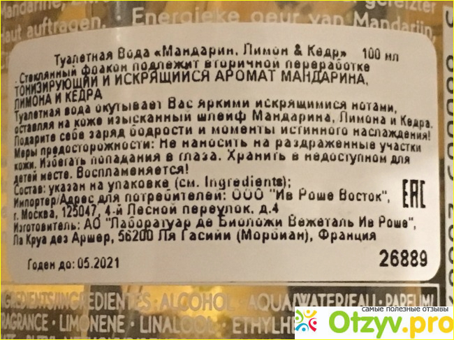 На обороте пузыречка размещена информация о парфюме на русском языке: