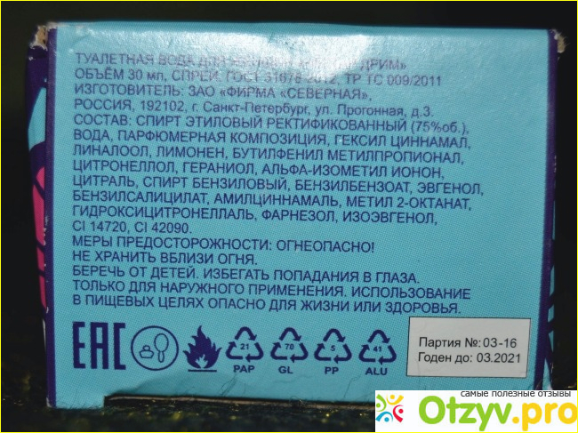 Состав нанесён сзади коробочки на английском языке. Что интересно, туда поместили и логотип "NLP", "New Line Perfume. New York - London - Paris". Там же указано, что аромат (fragrance) разработан в Англии. На дне же коробки указана более достоверная информация и на русском языке.