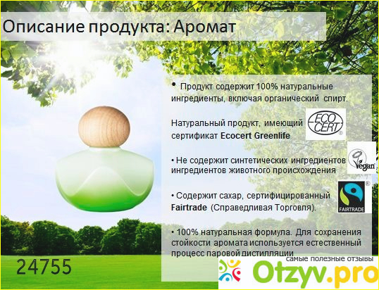 Я согласилась и сделала заказ, более неудачного подара у меня еще не было, хотя первоначально маме он понравился. Яркая коробочка в зеленых тонах, а внутри симпатичная баночка с крышечкой под дерево, сюрприз удался до поры до времени. Аромат был нежным, отдавал зелеью и цветочной примесью, вполне положительное впечатление. И как же я была удивлена увидев через пару месяцев не тронутый флакон на туалетном столике мамы. Когда я спросила в чем дело она ответила, что запах слишком резкий, через полчаса после нанесения становится удушливым и отдает дешевым одеколоном. Я решила попробовать сама. Да первоначально аромат был свеже-цветочный, отдавал зеленью, помоему, даже цитрус почувствовался, но после испарения верхних нот остался тяжелый осадок. Отдавало дедушкиным одеколоном Шипр, тоже нечто такое тяжелое и дурно пахнущее, некий нафталиновый осадок. Да и вдобавок ко всему слишком уж стойкая смесь не самых приятных ароматов. Так, что данная водичка нам пришлась совсем не по вкусу, со временем я сделала сюрприз в виде знакомого мне аромата.
