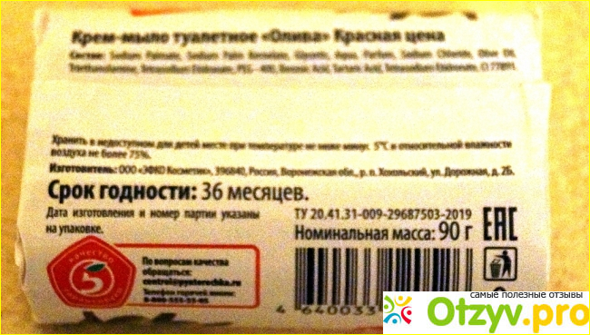 Что касается внешнего вида, то мыло упаковано в красивую бумажную упаковку, от которой глаза трудно оторвать. Особенно привлекает рисунок оливковой веточки, который сразу настраивает вас на хорошее настроение. На упаковке присутствует вся необходимая информация для покупателя, которая включает данные о производителе, которым является компания "Эфко Косметик" (Россия, Воронежская область). На упаковке указана дата изготовления данного мыла, срок годности, который составляет 36 месяцев. Отмечает ваш взгляд и то, что это мыло весом 90 грамм.