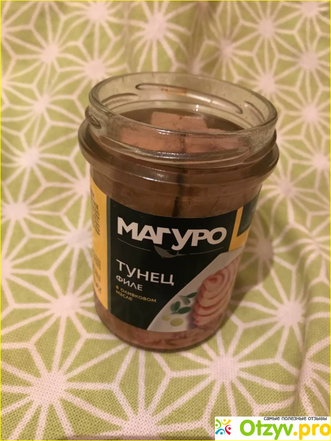 Внимание привлекла стеклянная банка, в которой отчетливо видны крупные куски тунца, а не какие-нибудь обрезки.
