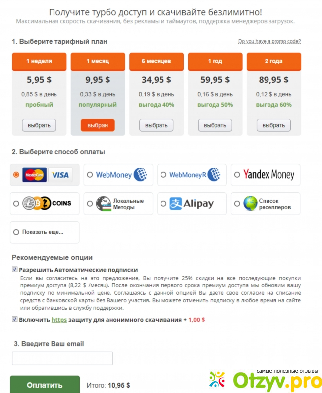 Платный доступ или VIP аккаунт. Минимум рекламы, скачивание без ожидания и ввода всяких букв или угадывания картинок. Объёмы не учитываются совсем. Более высокий процент заработка на предоставлении файлов третьим лицам. Стоит этот аккаунт не дорого – всего от 6 долларов.