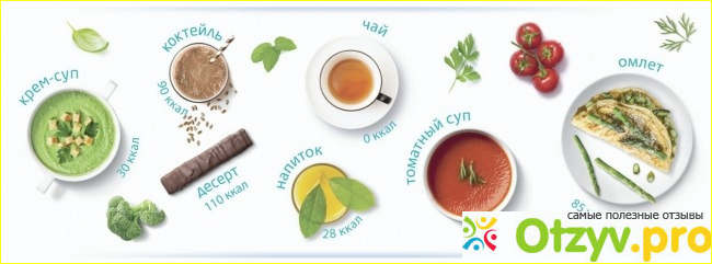 - кремообразный суп - их четыре различных вида и различных вкуса: жареный лук и мясо, с овощами, с курицей и специями, грибной. В каждом таком пакетике содержится не более, чем 40 ккал. Супы основаны на белках растительного и животного происхождения, в которых есть еще и волокна пищевые. Такой обед позволяет уталить голод и насытить организм.