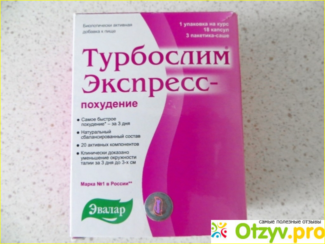 Со своей стороны, сдаваться я не собиралась. Однако нашла более легкий для себя выход, нежели полностью и навсегда отказать себе в любимых мною блюдах. Во-первых, конечно, чтобы привести свою фигуру в норму, я занялась активно спортом, особый клон делая на качание пресса и приседания (чтобы попа была красивой)). Но и про рацион не забыла. С той целью, чтобы присмирить аппетит, а также чтобы жировые отложение поскорее рассасывались, я приняла решение принимать БАДы для похудения. Естественно, не какие-то та непонятные таблетки неизвестного происхождения. А аптеке я увидела препарат «Турбослим» от известного мне и горячо любимого производителя биологически активных добавок «Эквалар». Прочитав отзывы об этом препарате, я решила взять себе упаковочку на пробу, чтобы убедиться, что данный препарат мне действительно подойдет. Выбор был большой, я но решила остановиться на БАДе «Турбослим Экспресс-похудение». В одной упаковке содержится восемнадцать капсул и три пакетика саше. Стоимость ее составляет шестьсот восемьдесят рублей.